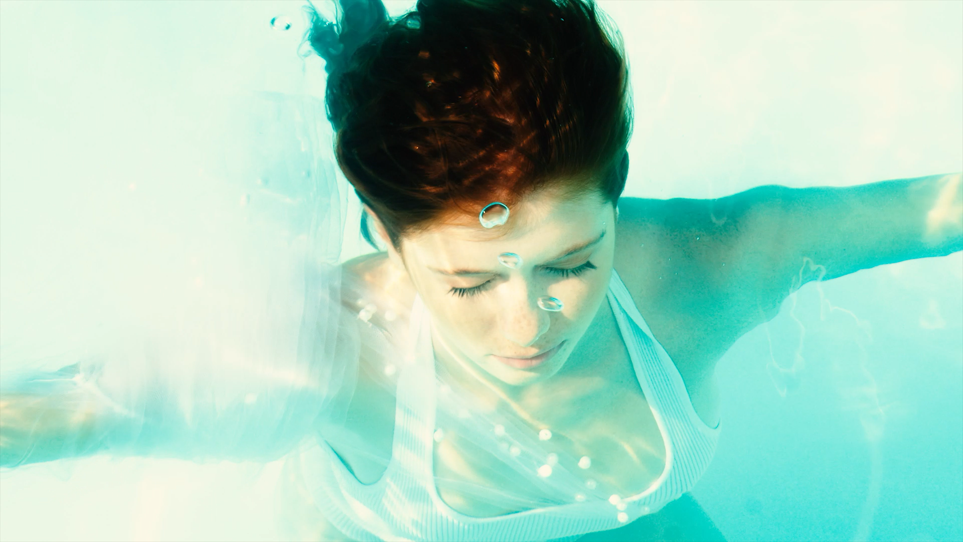 An artist submerging under water with her eyes closed by Santiago Bazan photographer.